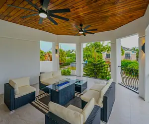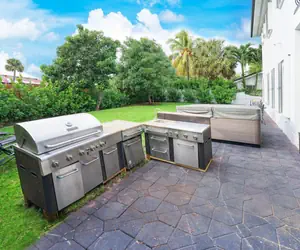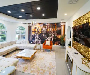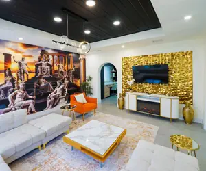 From the moment you enter the property, you’ll feel as though you’ve stepped into a luxurious Greek palace. Guests enjoy access to stunning shared spaces including two living rooms (one with an elegant gold-accented fireplace, the other with a sectional and large TV), a fully equipped kitchen with modern appliances, a dining room for six, and an outdoor patio with games, lounge seating, outdoor kitchen, and a hot tub!