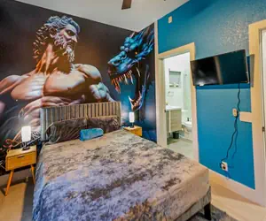 This property combines mythology with modern living, offering shared access to luxurious common areas: two stylish living rooms (one with a gold-accented fireplace), fully equipped kitchen, and a patio with a jacuzzi, outdoor games, and seating for fun-filled afternoons.