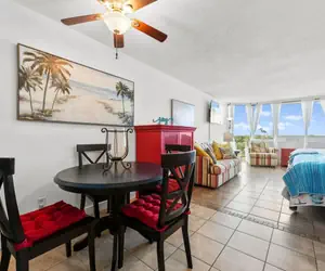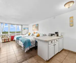 Enjoy a true beachfront stay at Top of the Gulf in Panama City Beach. This bright studio features beautiful Gulf views through large windows, direct beach access, and a resort pool just steps from the sand. Relax in a comfortable open layout with kitchenette and cozy seating, perfectly located near St. Andrews State Park, dining, and attractions — ideal for couples or a relaxing beach getaway.
