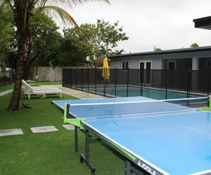 Grand Villa resort B: a freshly remodeled 2BR retreat in Miami's quiet Westchester neighborhood. Sleep up to 6 on plush beds, unwind in sleek walk-in showers, stream on the 55" smart TV, and cook in the open kitchen with stainless Samsung appliances. Enjoy blazing 500 Mbps WiFi, central A/C, room-darkening shades, washer/dryer, and a private entrance. Outside: heated year-round pool, hammock, BBQ, ping-pong, balcony, and alfresco dining. This is a unit that shares the patio and pool area with other guests staying on the property in the other unit.
