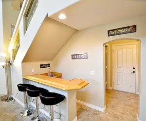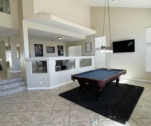 Upon entering, you step into one of two game rooms. The first has a pool table, and the second features a full size poker table- which overlooks the billiards area. The open, and spacious kitchen is perfect for cooking a large meal, while enjoying the company of your guests. The kitchen opens to the dining area and also overlooks the living room, complete with pool views, and large windows. The living room shows off cozy leather couches, a 55 inch TV, and wet bar. On the first level, you will also find a bedroom with outdoor access through French doors, a full bathroom, and a laundry room.