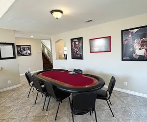 3,300 square foot home features five bedrooms, and 3 bathrooms, a 3 car garage, pool, spa, barbecue, dual game rooms, wet bar, flat screen TVs in each bedroom, and so much more.