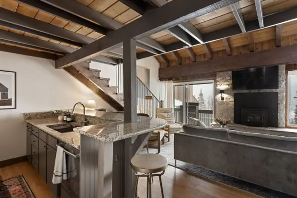 Soaring cathedral ceilings adorned with exposed beams draw your gaze toward breathtaking mountain vistas.