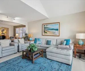 Attached to the dining room is a comfortable seating area with some board games and books to keep you entertained on a rainy day. Snuggle into this reading nook or join the rest of the family in the spacious living room, accented with beautiful seascape vibes, including stained glass features, that will make you instantly feel at home. This space is perfect for any type of way you want to spend with your family - movie night, board games, or just catch up and relax.