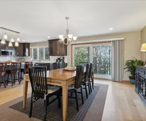 Once you walk up the stairs, on the left you'll find a huge, beautiful deluxe kitchen with high-end appliances and truly anything you need to prep, store, and clean any sized meal you want to prepare for your group. The space includes an island with additional seating, attached to the dining room that has enough seating for the whole home to eat together.