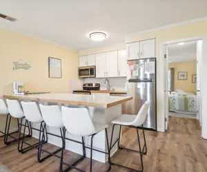 The fully equipped kitchen has everything you need to prepare meals, store your takeout, and craft midnight snacks. We love surprising our guests with a small welcome gift, so you can expect a delightful snack ready for you upon arrival. Just out the back door in the living room is the pool deck—perfect for cooling off during those hot summer days.