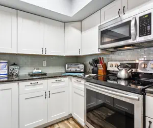 Off to the right of this hallway is the master suite, sporting a king bed, amazing decorations, and an ensuite with an attached, private bathroom. Want a bath to relax in? We got you - in our tub/shower combo here. We hope you don't have to work on your vacation, but if you do, there is a desk setup for you to answer a few quick emails during your stay. All of our bedrooms feature smart TVs, where you can log in to your own apps so you won't miss a beat on that movie you had to stop in the middle of on the plane.