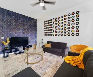 As you make your way upstairs, you'll notice some more art pieces bringing you back memories to your favorite new and old musicians/bands! To the left of the stairs is the master bedroom. The room shares a contrast of dark grays and black tones with pops of vibrant colors. You'll see a large gold mirror that was encompassed by over 2000 colorful guitar picks! This is a large master bedroom with a TV, accent chair, mosaic stool, and enough space to comfortably set up a child's play pen (if needed we do provide one.) The master bath has beautiful stand alone tub as well as a shower to fit anyone's preference!
