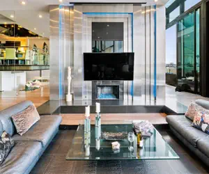 • On the lower level, you will find a sunken living room with a 25 ft stainless steel back lit by blue neon, a 75" HD LCD television for the whole family to enjoy, and floor-to-ceiling glass doors that open up to the back patio so that you can bask in the water views while feeling the sand between your toes. Not to mention the stained glass wall designed by a prominent New York artist whose work has been shown at the Met. A striking statement piece. Yes we have a professional massage chair for you to relax and watch our over-sized LCD TV. Enjoy the electronic fireplace that can change colors to your desire including full heat module.