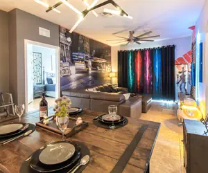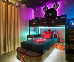 Park your X Wing or other transport for FREE right outside our Rebel Base. There are no parking fees here. Discover A New Hope as you begin your mission at RB203 where the first thing you'll notice is our crazy custom lighting throughout. An illuminated 6 foot lightsaber greets you at the door. There are 3 custom Bunk Cabins, all with places to store your gear. The Main Lounge area features a large Smart TV with all the apps, so you can log into your preferred programming. With high speed internet via fiber optic cable, you can wirelessly connect all your crew's devices for maximum performance. Speeds avg 500mbps up/down. Relax on the spacious, top grain leather Natuzzi sectional, while streaming the Skywalker Saga. The Bunk Cabins each have a smart TV. The Weapons Bay features insane custom lighting! Our acoustic fiber optic Starry Sky ceiling is the coolest thing you've never seen anywhere else. Your Padawans will put themselves to bed!