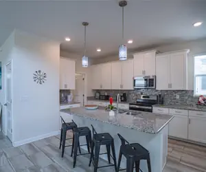 Step into a bright, open-concept main floor where your family can gather. The modern, fully equipped kitchen features a breakfast bar for casual mornings, flowing into a generous dining area and a comfortable living room with a Smart TV, perfect for cozy movie nights.