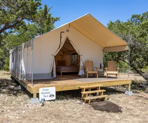 Your private tent is thoughtfully set up for comfort while keeping you close to nature. The tent itself has no electricity, but nearby shared spaces include everything you need, including a full kitchen, hot showers, and charging stations. Enjoy morning coffee as the sun rises from your deck and watch local wildlife pass by. In the evening, unwind by the fire or take in the Hill Country night sky, known for its excellent stargazing.