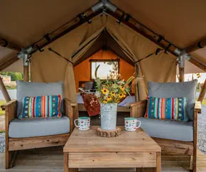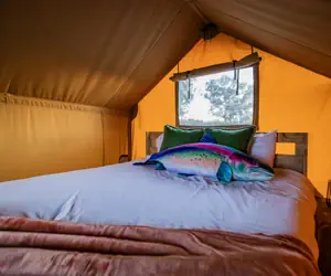 Wake up in your "Adventure" Glamping Tent to the sights and sounds of fall—deer grazing nearby and birds chirping in the fresh air. Inside, you'll find a comfortable queen bed, and heater/AC unit. Step outside onto your covered deck, sip coffee from the general store, and watch the sunrise paint the sky.