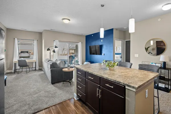 Relax in a bright, open living area made for unwinding. Stretch out on the comfortable sofa, stream your favorites on the 55” Smart TV with Netflix, Hulu, ESPN, Amazon Prime, and more, or open the large doors to the private patio. With views of the pool and clubhouse, it’s an easy place to enjoy Iowa’s sunsets, sip a drink, and slow things down.