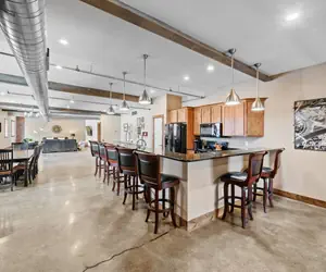 From the moment you step inside the living room, you won't believe all the space. An open-concept design while still maintaining the traditional loft style features such as exposed brick walls, steel beams, soaring ceilings and natural light flodding in from all directions. Maximum comfort is ensured for everyone with plenty of seating amonst three plush sofas centered around a 75" smart tv.