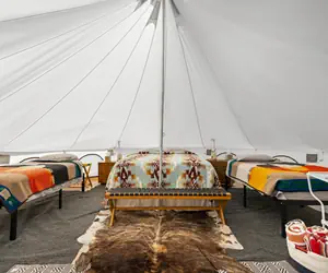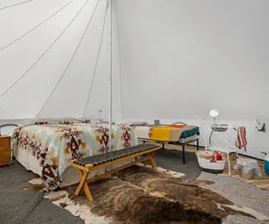 Step into your private bell tent retreat and enjoy the perfect balance of rustic charm and modern comfort. Furnished with one queen bed and two twin beds, this tent is designed to host families or small groups in a relaxing, welcoming space.