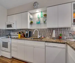 Full Kitchen with Refrigerator, Dishwasher, Microwave, Coffee Maker, Toaster and Laundry Area