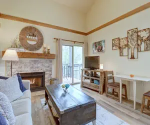 The living room features an HD TV, fireplace, and stunning mountain views. There is a private deck right off the living room where you can enjoy this amazing setting. The full kitchen has been recently updated and features a breakfast bar. There is a dining room table that seats 4.