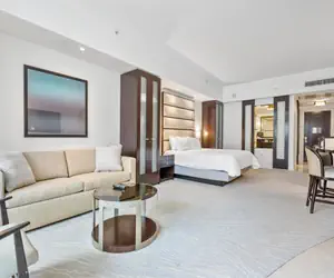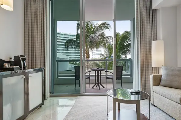 Located in the iconic Fontainebleau Hotel, one of the most sought-after beachfront destinations in Miami Beach, this deluxe Junior Suite is the perfect retreat for your vacation. Thoughtfully designed for comfort and convenience, the suite features a king-size bed with luxurious linens and goose-down pillows, along with a sleeper sofa that comfortably accommodates two adults. Guests can enjoy modern amenities, including a Smart TV, high-speed Wi-Fi, and a dedicated workspace. A breakfast bar equipped with a small sink, coffee maker, microwave, toaster, and mini fridge adds to the convenience. The opulent marble bathroom includes a jetted tub, a shower, and a makeup vanity, offering a spa-like experience.