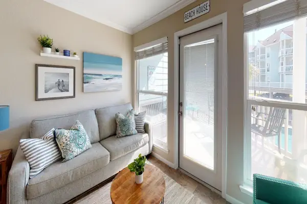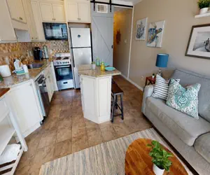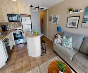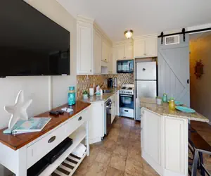 The beach vibe condo offers a living area which features a new queen sleeper sofa, large flat screen HD TV and a comfy chair. A very unique feature to this condo is the sliding barn door that will divide the living-room from the hallway and bedroom for added privacy. High speed premium Wi-Fi is provided for guests' convenience to be able to post photos of your family vacation on your social media pages.