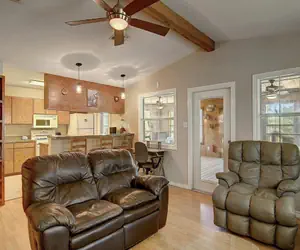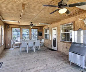 The main house has two bedrooms and two baths. The master bedroom has a king bed and attached bathroom. The second bedroom has two queen beds. Plenty of room and seating in the living room. The galley style kitchen has all you need to cook up a meal. Head out to the enclosed bonus space with dining table for a view of the water and to enjoy the evening breeze without the mosquitoes.