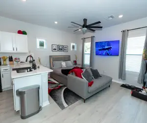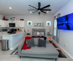 This studio home is brand new! You won't find a cleaner and fresher home in Downtown Orlando! Beautifully modern and equipped with all new state of the art appliances and amenities.You can comfortably sleep a maximum of 2 people in the studio. This studio home is located in the backyard of the main home, with its own separate entrance. The kitchen is fully stocked & furnished with all new appliances and has everything you need. Washer and dryer available as well.*For larger groups, you can book the main front home that sleeps a total of 4 guests. Check out our other listings or contact us for more details.Highlights:Newly constructed Home (July 2021) - sparkling clean and all new appliances and amenities, with Hot Tub!Amazing modern lighting and furnishing all throughout the homeAmazing location in downtown OrlandoPet Friendly (with additional fee) up to 25lb weight restriction for pet, limit 1.No cats allowed.Amazing location in Downtown Orlando, close to Courthouse and Hospitals. Bicycle rentals available and great for picnics!*Personal massage therapist available to be scheduled on Sundays. Reach out to us for more info!Close to Downtown Orlando and just minutes to all the major theme parks. Private entrance with easy keyless entry. Great access to many local bars, restaurants, and entertainment within walking distance and many more a short drive away.Disney, Universal, Orlando International Airport, Orange County Convention Center are all within a half-hour drive. Only an hour from the beach, Kennedy Space Ctr., etc. Great proximity to everything in Central Florida from the beaches to Disney.*Please note this is a completely non-smoking property, including outdoors. The homeowner is extremely allergic.There is a $500 NON REFUNDABLE SMOKING FEE if the house smells like smoke. This includes vaping.*No parties allowed. Strict Occupancy limit enforced.*Quiet hours starting from 9 PM to 9 AMPlease note that there is an area in between the two homes on the gray pavers that does not belong to this listing and please respect the privacy of the other home and do not use any of the amenities in that area as they belong to another property.