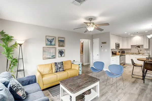 Inside you'll find a spacious open living area with two comfortable sofas, two side chairs, a large TV, dining table with seating for four, a beautiful kitchen with stainless appliances, tons of counter space, and everything you need to whip up a meal, or a margarita.