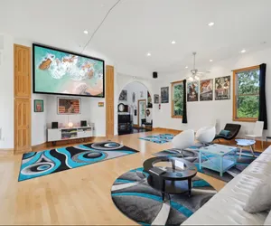 The Starlight Tower River Manor & Events / Weddings is a 9 bedroom 4 bath, 2 Kitchens or (12 bedrooms with use of Futon beds in various rooms, like the exercise, space, or Music rooms, or 13 bedrooms, 5 baths 3 kitchens with rental of Love suite, with Round Hot Tub and 8-Jet blasting massage shower) the manor also includes Vintage Arcade gallery, Space room with Telescopes Observatory, 35 - 50+ person Theater, and Huge Game room, and Bar! The Manor is perrfect for large family gatherings, Weddings up to 150 max, group getaways, and special events, Our riverfront Manor, offers a blend of vintage and modern decor. The Love wedding suite with King bed and Awesome Round Hot tub with lights and many features,plus an incredible 8-Jet blasting Massage Shower can be rented for your special event or as part of the manor with connector door, or seperate entrance. We also include another personal hot tub in the Ocean Suite included with manor rental. You will love the extra spacious layout, with a huge Foyer and a Magnificent curved Round custom built white Maple Staircase with flying 2nd floor to 3rd floor Staircase crossing over a curved bridge going through a round circle entrance to the 3 story Vintage Game room / Bar and Telescope Observatory Space Room and Rock Star musical instrument room. There is also an awesome dolphins, and mermaid beach themed hot tub suite for you to relax and reconnect. the 72 foot Tower is high up on the Hill, and you can enjoy the Outer Space room with telescopes while enjoying the incredible views with over 5+Acres on the Bark/Rock River.