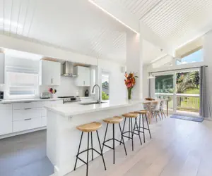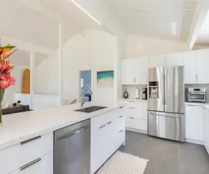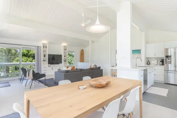 The upstairs master suite has ocean views from a luxurious king-sized bed and features plenty of windows to let in the cool, tropical cross-breeze. This home is designed and perfectly situated to maximize the natural cooling effect of the island’s trade winds. The spacious master suite also has a wonderful en-suite bathroom with dual vanities and a walk-in shower. All three downstairs bedrooms have an abundance of natural light, and open to an outdoor lanai. There are an additional one and half baths on the lower level.