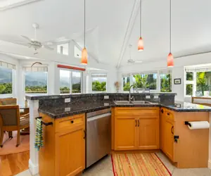 Come stay at this well-appointed, immaculate townhome! The owners have thoughtfully designed the space with authentic Hawaiiana décor and an abundance of beautiful, local art. In the winter after a heavy rain, dozens of cascading waterfalls are visible in the steep spines of the Namahana mountains from your private lanai. Just a short seven-minute drive to Hanalei and only fifteen minutes to Kilauea lighthouse, this wonderful townhome is in the perfect location to enjoy all of Kauai’s finest sights.