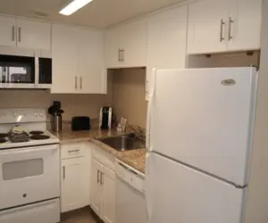 Use your private entrance to enter this particular home located on the second floor. This suite has been remodeled to include beautiful upgraded furniture, tile, cabinets, and more! Furnished with a king size bed, your suite has all you need to feel right at home from the moment you walk through the front door. Each unit has a spacious living room with a dining area; walk through kitchen with full size appliances; and a bedroom with an attached bathroom, large walk in closet, and private patio (balcony)!