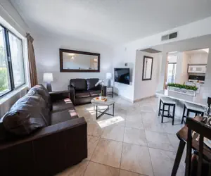 The unit is thoughtfully designed with comfort and convenience in mind. Each room features a welcoming living space, a fully equipped kitchen with full-size appliances, a private balcony perfect for morning coffee or evening relaxation, and a walk-in closet for ample storage.