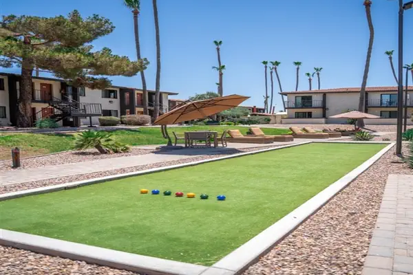 Our community features a gorgeous, large outdoor community space with a fireplace, abundant seating, bocce ball and other outdoor lawn games; 3 grilling stations, heated pool and hot tub, additional seating areas and misters for those warm Arizona days.