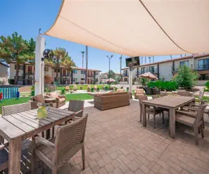 Our community features a gorgeous, large outdoor community space with a fireplace, abundant seating, bocce ball and other outdoor lawn games; 3 grilling stations, heated pool and hot tub, additional seating areas and misters for those warm Arizona days.