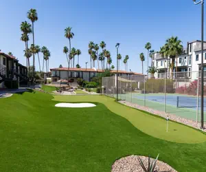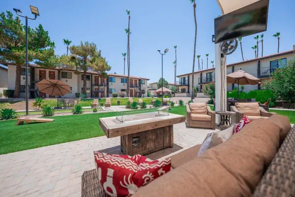 Our community features a gorgeous, large outdoor community space with a fireplace, abundant seating, bocce ball and other outdoor lawn games; 3 grilling stations, heated pool and hot tub, additional seating areas and misters for those warm Arizona days.