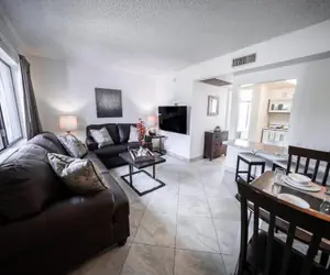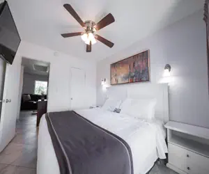 Use your private entrance to enter this particular home located on the second floor. This suite has been remodeled to include beautiful upgraded furniture, tile, cabinets, and more! Furnished with a king size bed, your suite has all you need to feel right at home from the moment you walk through the front door. Each unit has a spacious living room with a dining area; walk through kitchen with full size appliances; and a bedroom with an attached bathroom, large walk in closet, and private patio (balcony)!