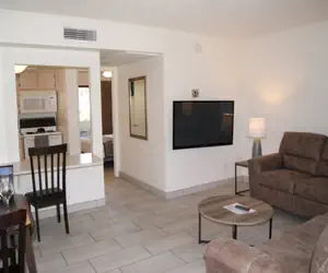 Our fully furnished 1 bedroom homes include a perfectly sized living room, a private bedroom with a king size bed, a full size kitchen that includes a microwave, refrigerator, stove and many include a dishwasher, as well. You will also find a large walk-in closet, ample storage areas and a private patio. All utilities are free when you stay at Scottsdale Park Suites this includes Cable with HBO, High Speed Wi-Fi, Electricity, Water/Sewer/Trash.