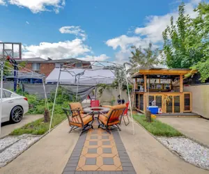 There are 3 bedrooms, with a queen bed in the first and second bedrooms, and 2 bunk bed sets in the third to sleep a total of 8 people. The 2 bathrooms come with combination tub/showers. In the backyard, you will find a shared lounging area with outdoor furniture to relax. The backyard is fenced for privacy.