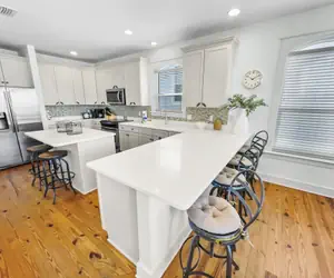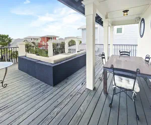 Walking into the first floor you'll find the queen bedroom and twin bunk room with a shared jack and jill bathroom. Traveling up to the second floor is where the recently updated kitchen is, with ample space and an island for serving, making for a fun evening of cooking, visiting, and entertaining. Just off the kitchen is the second-floor master bedroom with King sized bed with a private balcony access and master bathroom. The third floor is a hidden gem. A second king master bedroom with a daybed and with connecting bunk room and bathroom giving plenty of space for friends and family to sleep. The master bathroom has a double vanity, separate tub and shower, and a private 3rd floor balcony. Don't miss out and book The Pool House today!