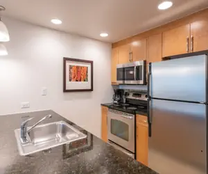 This condo has granite counter-tops and standard furnishings, a dining area, and a washer/dryer set.The Bedroom