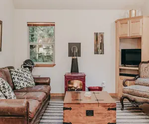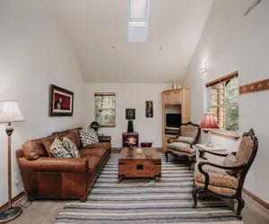 This delightful 1-story, 3-bedroom, 2-bath cabin is absolutely perfect for your family's vacation. Upon entering through the front door, you'll discover an open and airy kitchen, dining, and living area with stainless steel appliances including a Sub Zero refrigerator/freezer, a large dining table with four chairs, a breakfast bar with two bar stools, and a comfy living space accompanied by a free standing gas fireplace to cozy up to, and a flat screen monitor with a Blu Ray player.