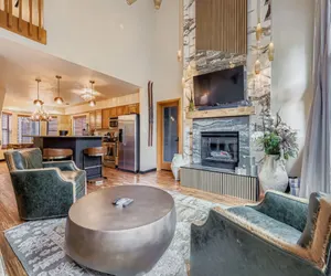Step into the open living space, where vaulted ceilings exude an air of elegance. Sink into plush seating as you indulge in entertainment on a sleek flat screen TV, or bask in the warm ambiance of the gas fireplace. Venture out to the inviting deck, adorned with a private hot tub, setting the stage for memorable evenings of relaxation and indulgence.