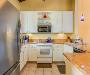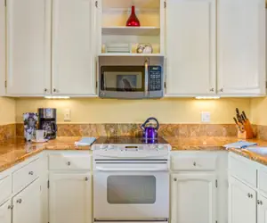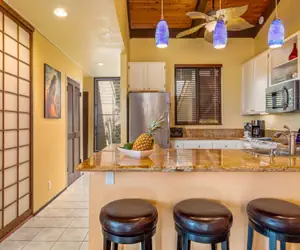 A super-spacious kitchen is equipped with a new fridge, a microwave, and a quiet dishwasher. Your breakfast can be served at the sprawling granite breakfast counter or on the lanai with a serene morning view.