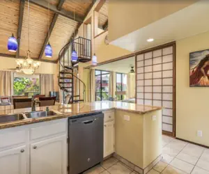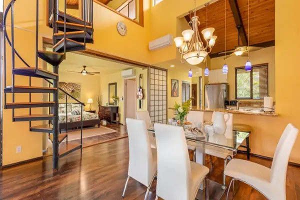 The master bedroom offers a peekaboo ocean view and beautiful mountain views to wake up to, and receives intoxicating morning breezes. It has a gel foam king bed for the ultimate comfort. The second bedroom with a plush queen bed can be closed off by shoji doors for privacy into a suite with bath. A spiral staircase leads to a very private, cozy third (converted loft) bedroom with a King Sized Bed and its own closet.