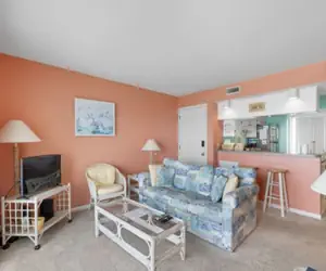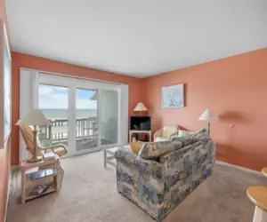 When entering the unit you will be met with a spacious living room space. The living room space offers a queen sleeper sofa, cable TV, and deck access. Off the living room separated by a bar peninsula is the kitchen with ocean views. It is well equipped with stainless steel appliances, Keurig coffee maker, a drip coffee maker and everything you need to make a a meal. Off the living room and kitchen is a small hall which leads to the bathroom and laundry closet with a washer and dryer. At the other end of the hall is the oceanfront bedroom with a large window to enjoy the view. The bedroom has a queen bed cable TV and a door to the deck. Equipped with a dresser, night stands and walk in closet
