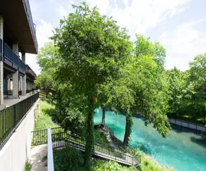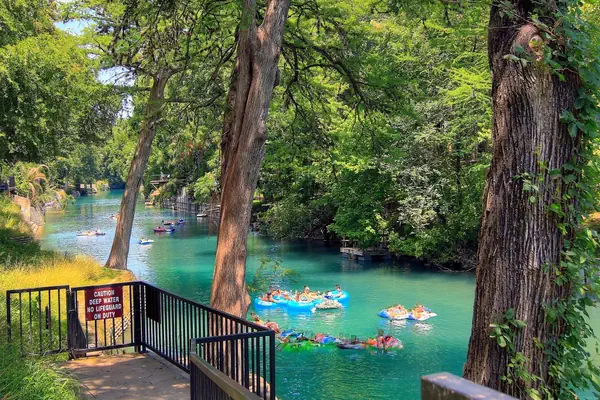 Beautiful 2 bedroom, 2 bath condo at Camp Warnecke Estates is just steps from the Comal River and right across the street from Schlitterbahn! The open living room/dining room is a great place to relax after a day on the River. Cable TV and free Wifi. The dining table has seating for 4 and the breakfast bar has seating for 4. The cozy kitchen is equipped with all the basics you will need to cook breakfast, lunch and dinner. The spacious master bedroom has a king size bed, and cable TV. The spacious master bathroom has everything you need to get ready! Enjoy the beautiful shower or take a long relaxing bath in the separate bathtub. The second bedroom also has 2 queen beds and is just down the hall from the second spacious bathroom with a walk-in shower wash. There is also a washer and dryer in the unit. Accommodates 6 people very comfortably. All bedrooms and bathrooms come stocked with high quality linens.