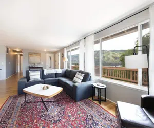 Guest access includes the full house with three bedrooms, two bathrooms, and a spacious living area with stunning views. The expansive deck feels like an acre of outdoor space.
