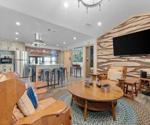 The kitchen is well-equipped to do your own cooking and there is more than adequate dining space for everyone to sit together. The bunk room is unlike any other rental in the hill country! Fun for everyone! Hot tub, Firepit, cornhole, board games and cards.