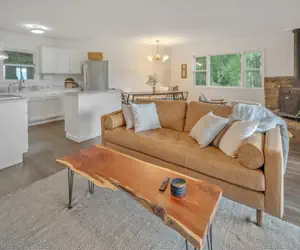 In our living room, you can enjoy views of the mountains, read a book next to the wood stove, or kick back on the couch and watch your favorite movie on our 55" Samsung Frame TV with access to all streaming services. The kitchen is fully equipped with a spacious fridge, oven, dishwasher, microwave, espresso machine, coffee maker, waffle maker, blender, and all essential spices and kitchen ware to cook meals with the family or bake your favorite treats. Enjoy the mountain air and mountain views Weber grill on the deck along with rocking chairs where you can enjoy the cool mountain air. There's also strong Wi-Fi signal in every part of the house and Nest speakers to play your favorite music. We have keyless entry and security cameras at both the front and back entrances.