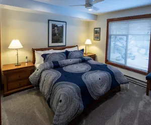One of the available units is the 3201 - Powderhorn Lodge Two Bedroom, Two Bath Condo. This unit includes a master bedroom with a king bed, a second bedroom with a twin bed and twin bunk bed, and a sleeper sofa in the living area. The unit is located at the quiet end of the hall and offers a courtyard and back mountain view. The maximum occupancy for this unit is 7 guests.